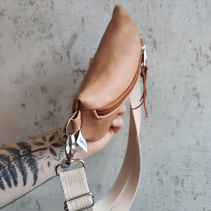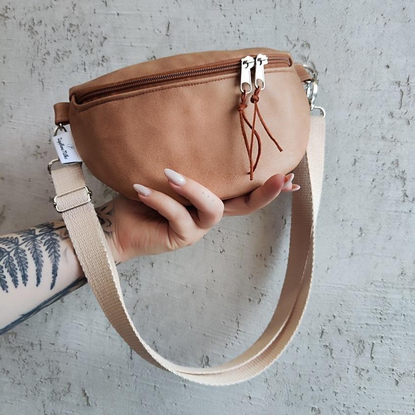 Nereczka półksiężyc jeszcze mniejsza od nerki mini. Uszyta z tkanin tkaniny a la nubuk rudejj. Nerka jest jednokomorowa, bez przegródek w środku. Idealna na najpotrzebniejsze rzeczy takie jak telefon, dokumenty i kluczyki (pomieści dosłownie tylko tyle). W komplecie do nerki otrzymasz bawełniany beżowy pasek, ale jest oczywiście możliwość jego wymiany na inny kolor :) Nerka nie jest zależna od paska. Idealna do noszenia w pasie jak i przez tułów. Wymiary nerki: długość w najszerszym miejscu 22cm, wysokość mierzona na środku nerki 14cm. Pasek z możliwością regulacji długości: minimalny obwód wraz z nerką ok.83cm, maksymalna długość ok.127cm.
