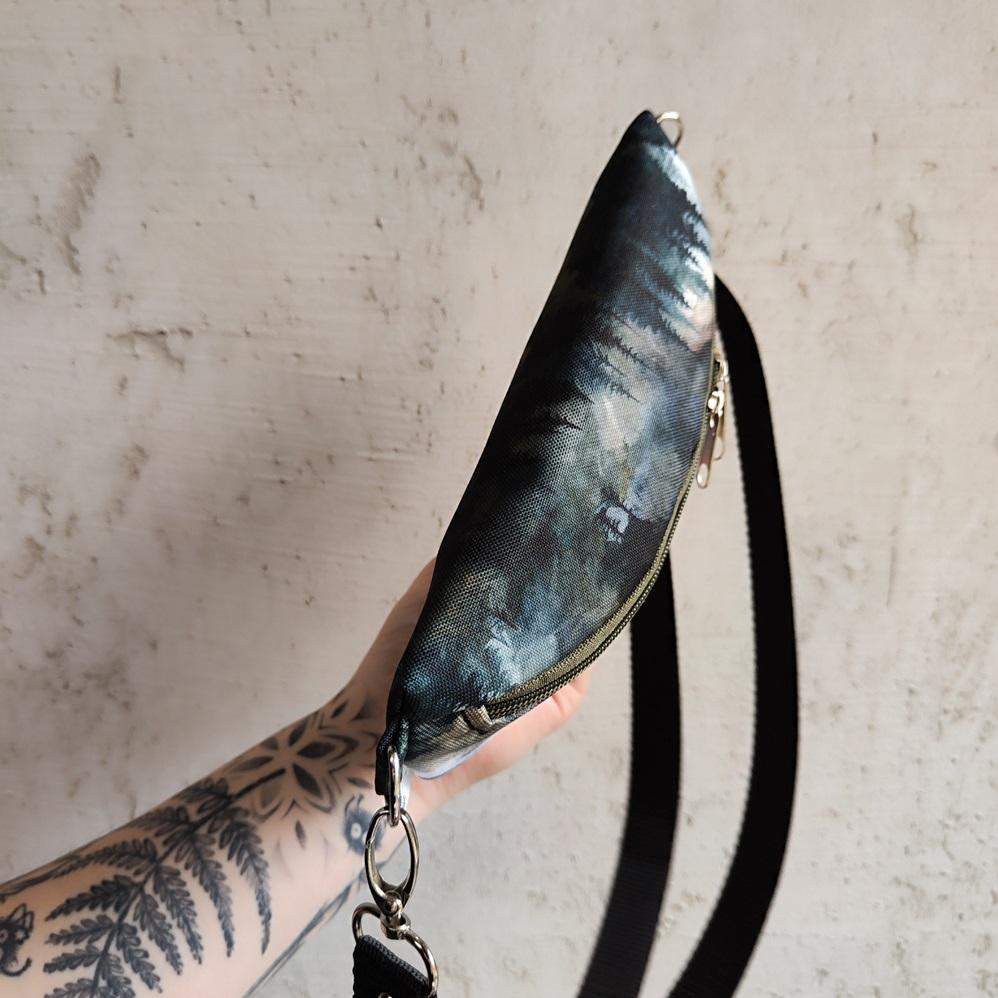 Nereczka półksiężyc jeszcze mniejsza od nerki mini. Uszyta z poliestru wodoodpornego z nadrukiem oraz bawełny (środek nerki).Nerka jest jednokomorowa, bez przegródek w środku. Idealna na najpotrzebniejsze rzeczy takie jak telefon, dokumenty i kluczyki (pomieści dosłownie tylko tyle). W komplecie do nerki otrzymasz pasek widoczny na zdjęciach, ale jest oczywiście możliwość jego wymiany na inny kolor :) Nerka nie jest zależna od paska. Idealna do noszenia w pasie jak i przez tułów. Wymiary nerki: długość w najszerszym miejscu 22cm, wysokość mierzona na środku nerki 14cm. Pasek z możliwością regulacji długości: minimalny obwód wraz z nerką ok.83cm, maksymalna długość ok.127cm.