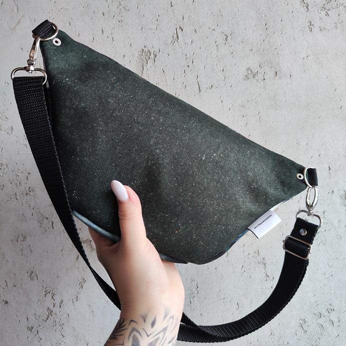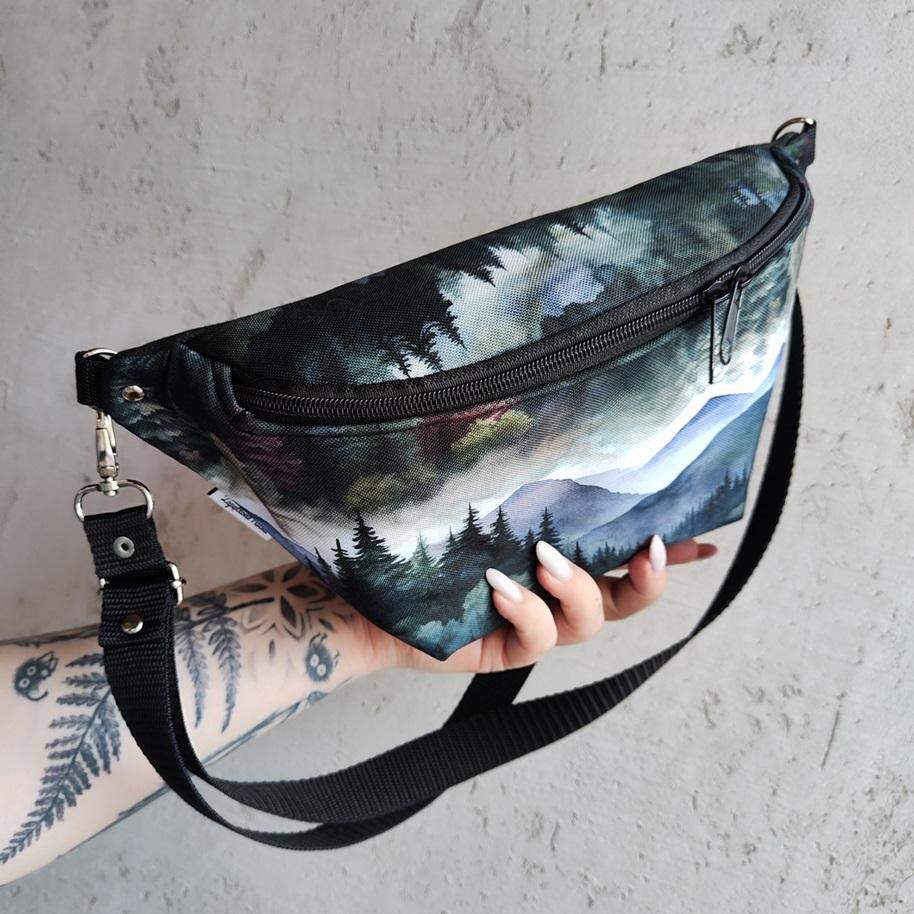 Nerka uszyta z poliestru wodoodpornego z wyjątkowym unikatowym nadrukiem ''las i góry'' (przód i klapa nerki), tkaniny tapicerskiej w kolorze ciemnej zieleni (tył nerki). Regulowany pasek nośny z możliwością wymiany (nerka posiada po bokach 2 metalowe półkola, które umożliwiają szybkie zapinanie/ wymianę paska np. na inny kolor). Wymiary: 32cmx17cmx7cm (klapa). W środku nerki kieszonka przegródka oraz kieszonka zapinana na zamek. Obwód paska wraz z nerką ma wymiary: minimum 95cm obwód, max 140cm obwód (jeśli interesuje Cię inny obwód paska napisz do mnie wiadomość. W komplecie pasek widoczny na zdjęciach szeroki na 2,5cm.