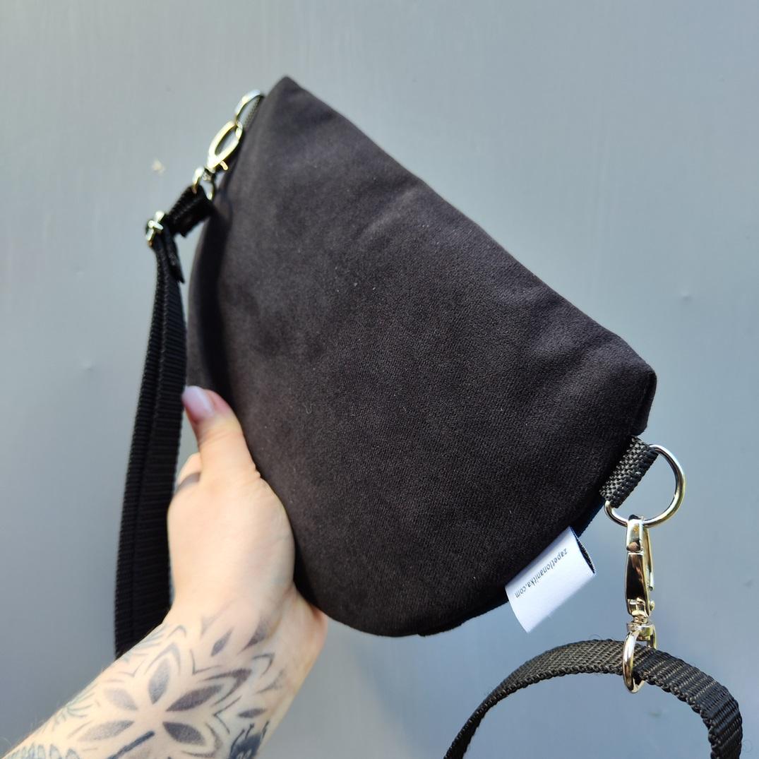 Unikat!!! - tylko 1 sztuka. Nerka półksiężyc jeszcze większa od nereczki półksiężyc. Uszyta z końcówek tkanin, żeby nie marnować, w duchu zero waste. Wewnątrz nerki wszyta bawełniana podszewka. W komplecie również regulowany pasek z możliwością wymiany na inny kolor. Wewnątrz nerki kieszonka przegródka. Wymiary nerki: 25 cm x 18 cm x 8 cm klapa. Nerka jednokomorowa, idealna na drobiazgi takie jak portfel, telefon, dokumenty, kluczyki, chusteczki.