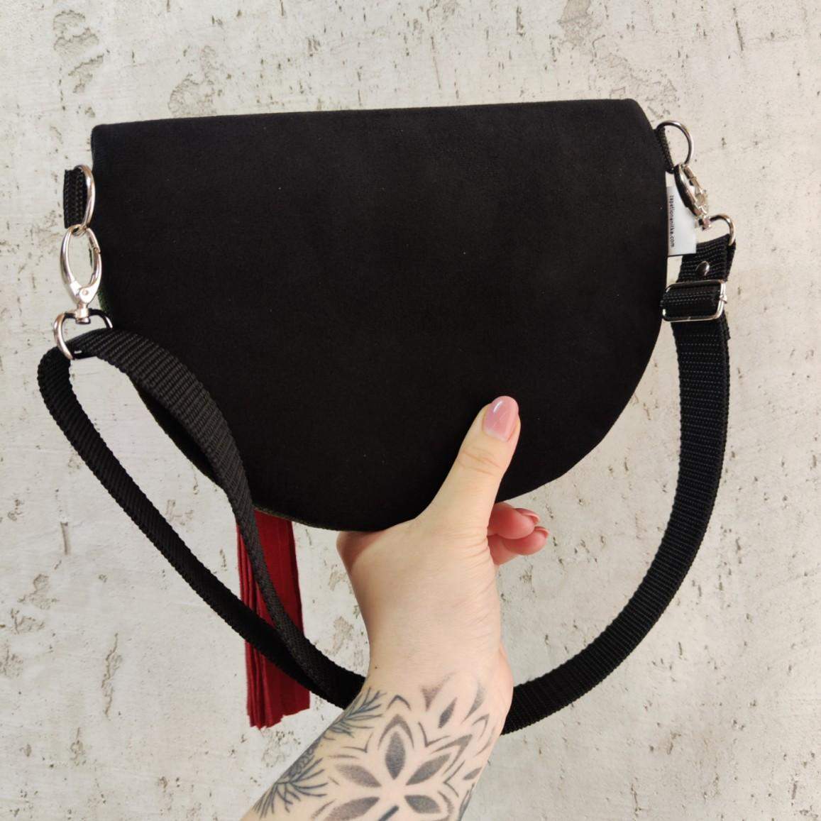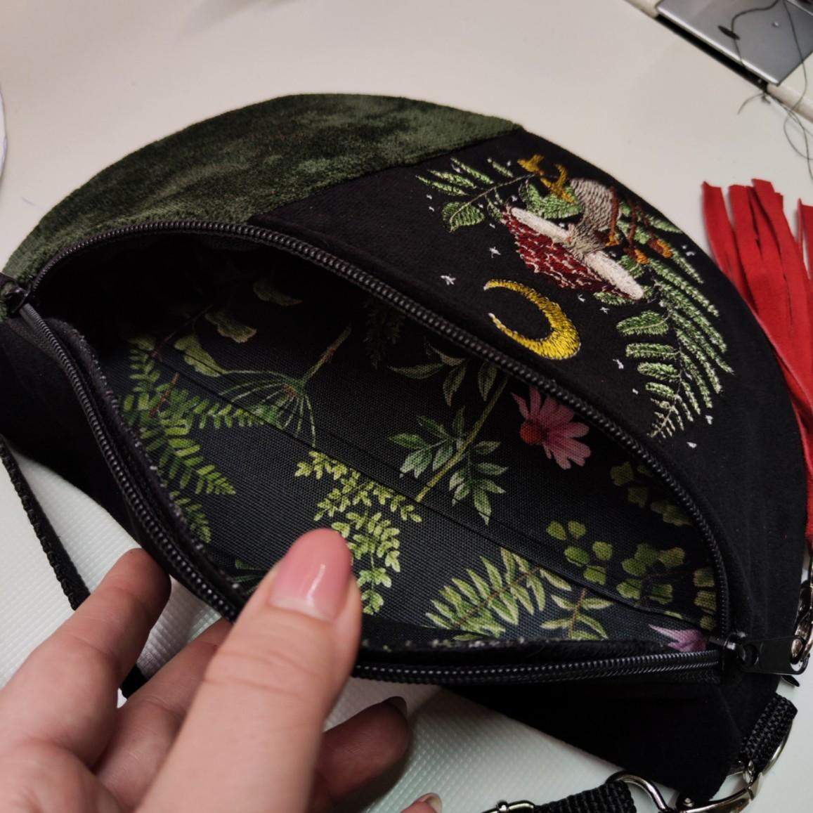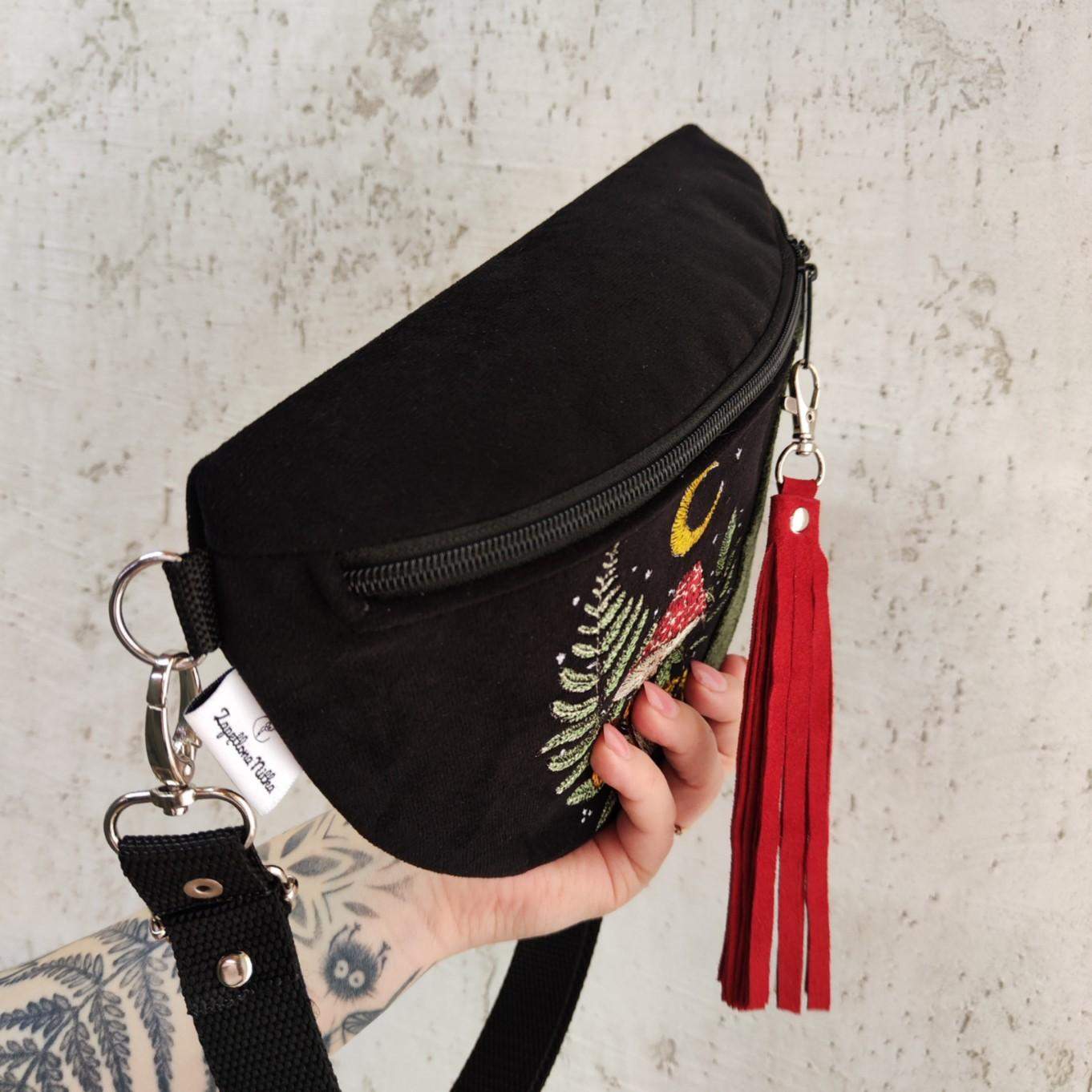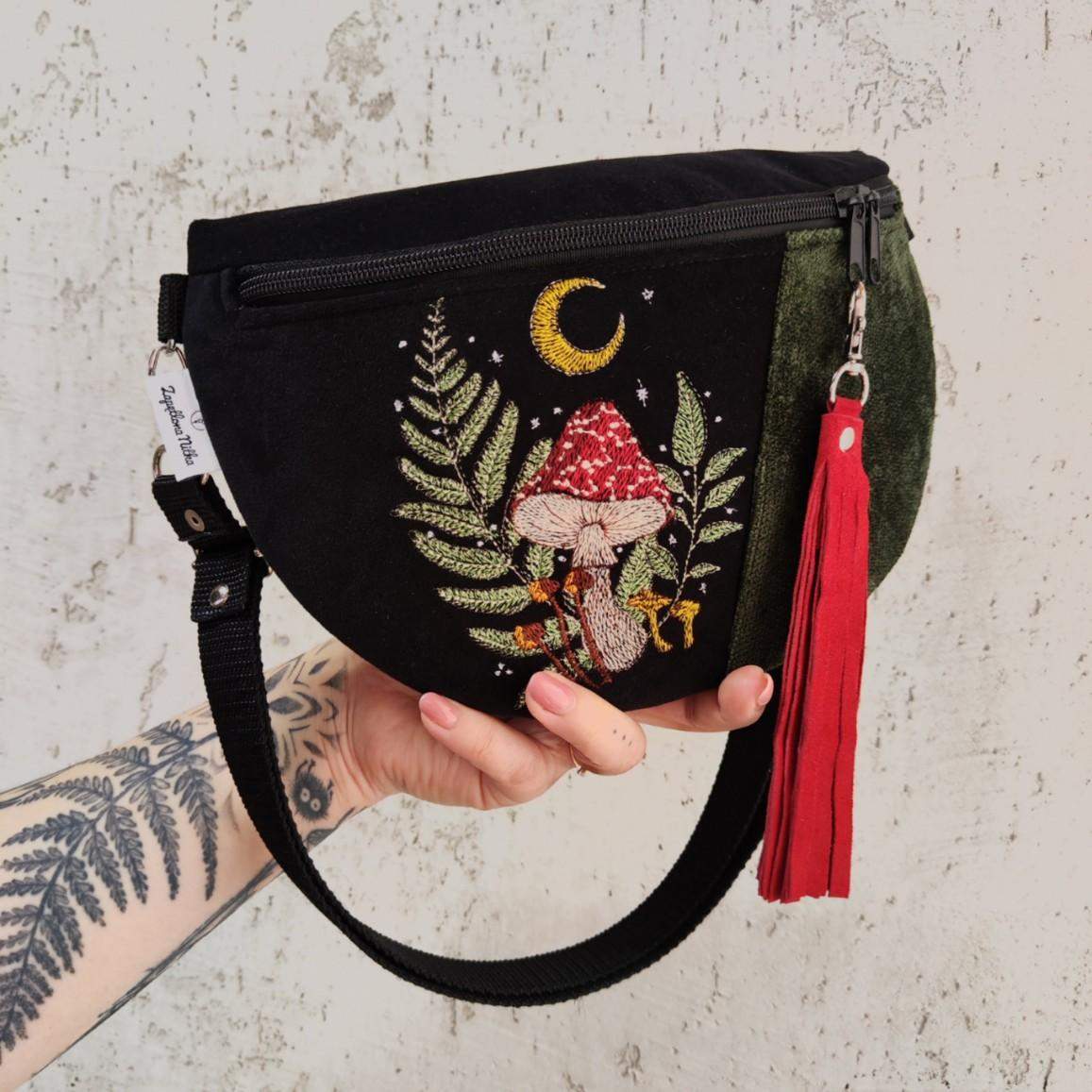 Nerka półksiężyc jeszcze większa od nereczki półksiężyc. Uszyta z czarnej tkaniny tapicerskiej a la zamsz w połączeniu z tkaniną w kolorze ciemnej zieleni khaki, na przodzie unikatowy haft. Wewnątrz nerki wszyta kieszonka przegródka. W komplecie również regulowany pasek z możliwością wymiany na inny kolor. Wymiary nerki: 25 cm x 18 cm x 8 cm klapa. Nerka idealna na drobiazgi takie jak portfel, telefon, dokumenty, kluczyki, chusteczki.