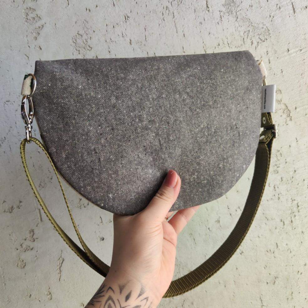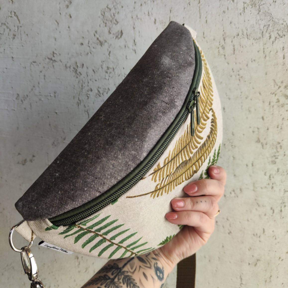 Nerka o fasonie półksiężyc, większa od nereczki półksiężyc. Uszyta z tkaniny bawełniano lnianej z nadrukiem liści paproci oraz tkaniny tapicerskiej w kolorze zieleni. Wewnątrz nerki wszyta bawełniana beżowa podszewka oraz kieszonka przegródka na tylnej części wewnątrz. W komplecie do nerki regulowany pasek z minimalnym obwodem 88 cm. Jeżeli potrzebujesz innego minimalnego obwodu wystarczy, że dodasz taką informację w komentarzu do zamówienia. Wymiary nerki: 25 cm x 18 cm x 8 cm.