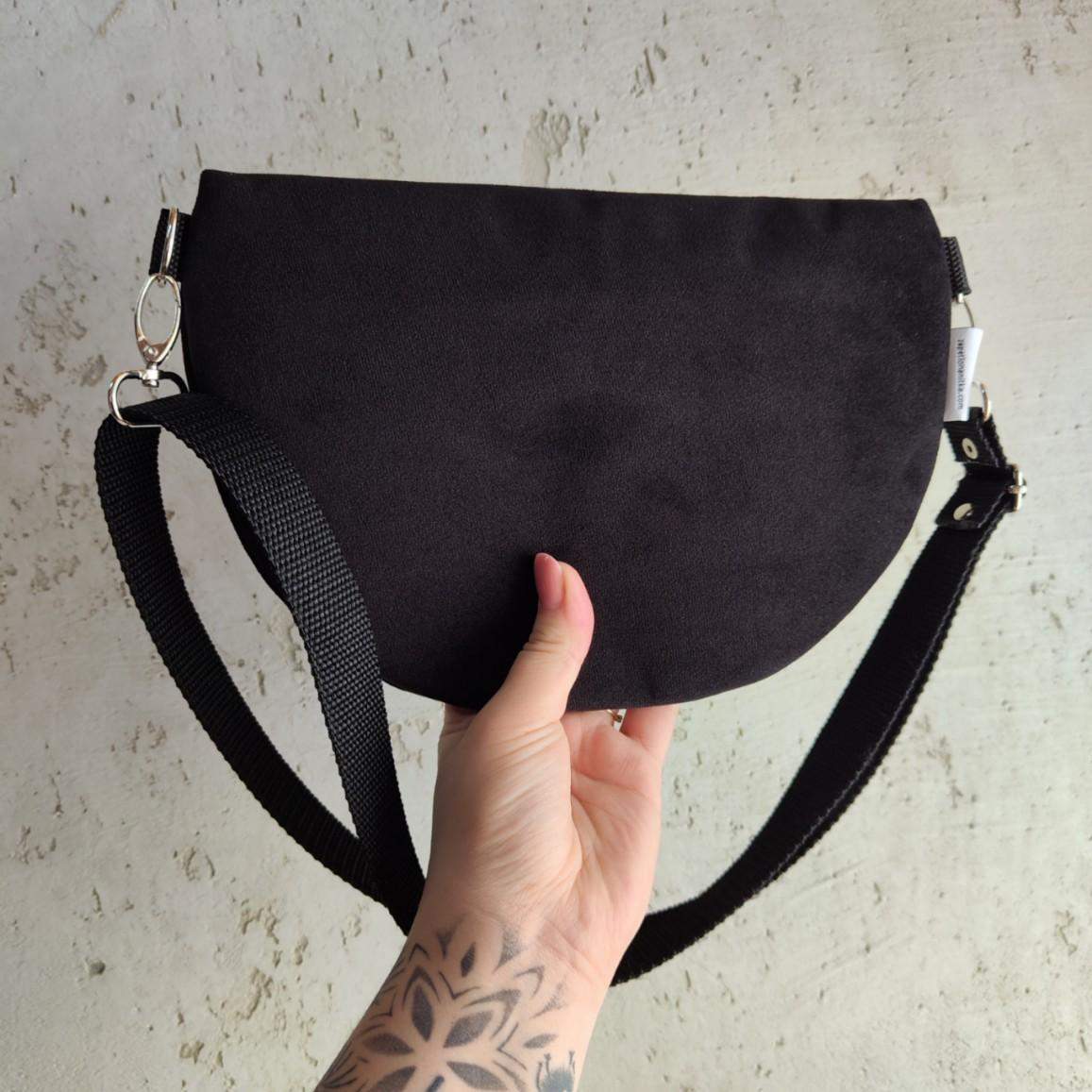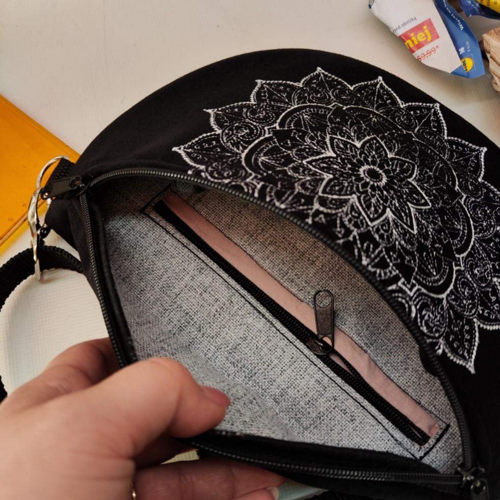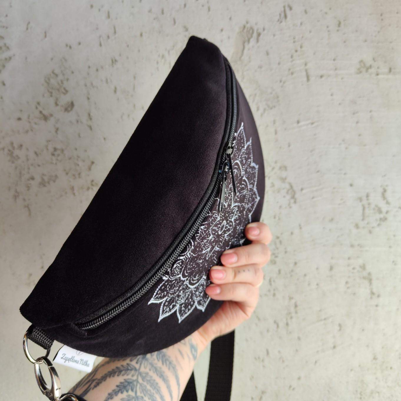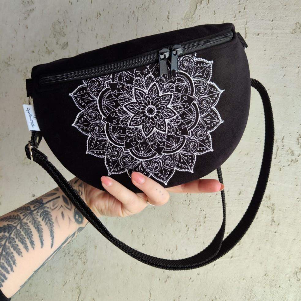 Nerka półksiężyc jeszcze większa od nereczki półksiężyc. Uszyta z czarnej tkaniny tapicerskiej a la zamsz, na przodzie unikatowy haft mandali. Wewnątrz nerki wszyta kieszonka zapinana na zamek. W komplecie również regulowany pasek z możliwością wymiany na inny kolor. Wymiary nerki: 25 cm x 18 cm x 8 cm klapa. Nerka idealna na drobiazgi takie jak portfel, telefon, dokumenty, kluczyki, chusteczki.