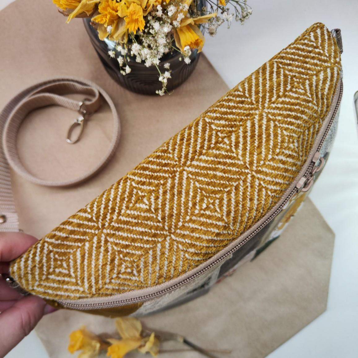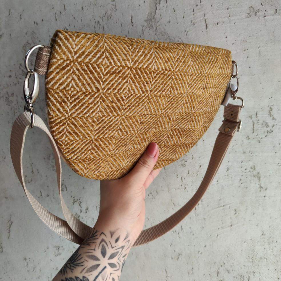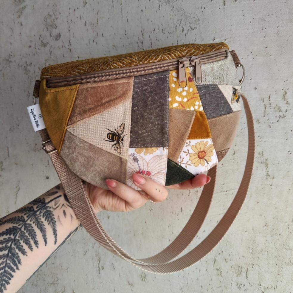 Unikat!!! - tylko 1 sztuka. Nerka półksiężyc jeszcze większa od nereczki półksiężyc. Uszyta z końcówek tkanin, żeby nie marnować, w duchu zero waste. Wewnątrz nerki wszyta bawełniana podszewka oraz kieszonka przegródka. W komplecie również regulowany pasek z możliwością wymiany na inny kolor. Wymiary nerki: 25 cm x 18 cm x 8 cm klapa. Nerka idealna na drobiazgi takie jak portfel, telefon, dokumenty, kluczyki, chusteczki.