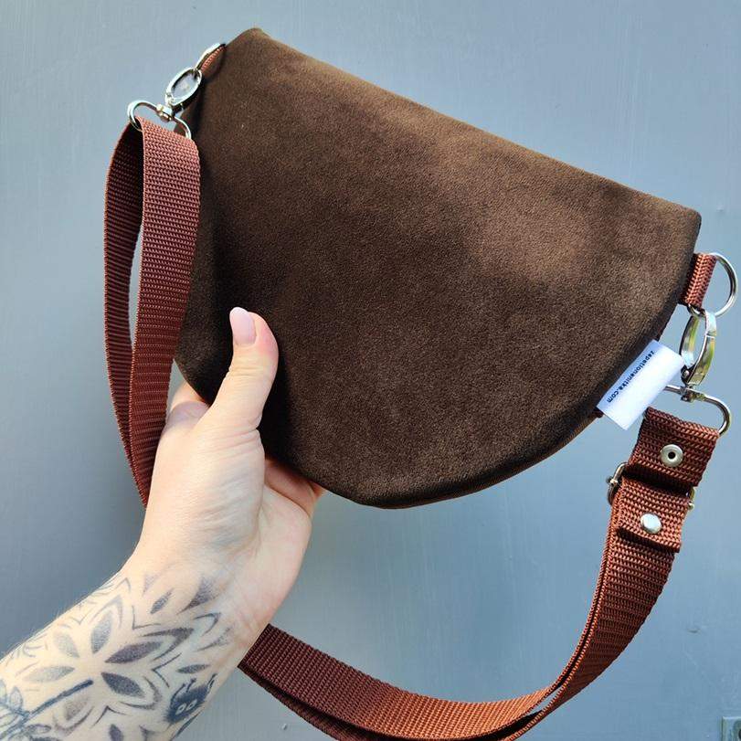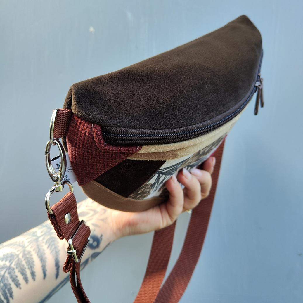 Unikat!!! - tylko 1 sztuka. Nerka półksiężyc jeszcze większa od nereczki półksiężyc. Uszyta z końcówek tkanin, żeby nie marnować, w duchu zero waste. Wewnątrz nerki wszyta gruba beżowa lniana wodoodporna podszewka. W komplecie również regulowany pasek z możliwością wymiany na inny kolor. Wymiary nerki: 25 cm x 18 cm x 8 cm klapa. Nerka jednokomorowa, idealna na drobiazgi takie jak portfel, telefon, dokumenty, kluczyki, chusteczki.