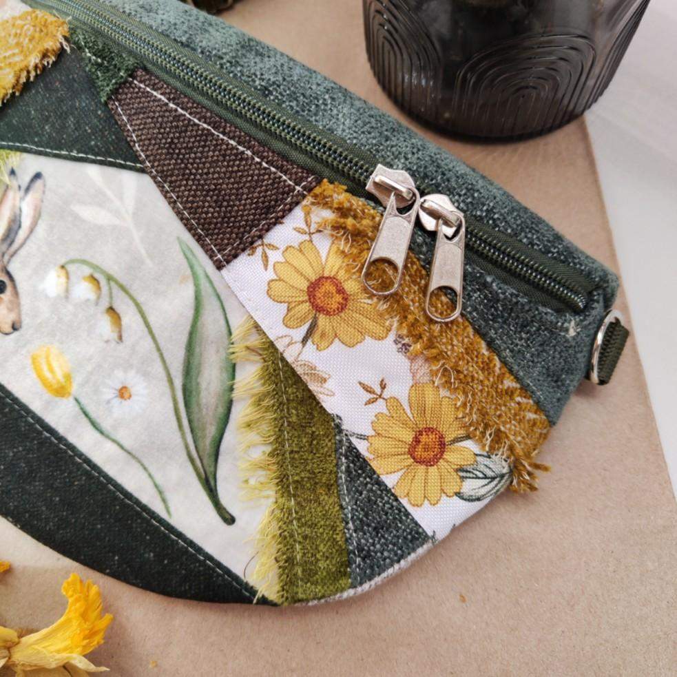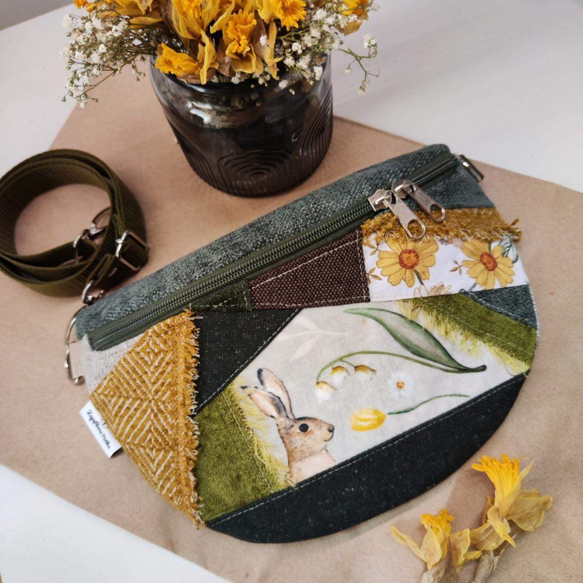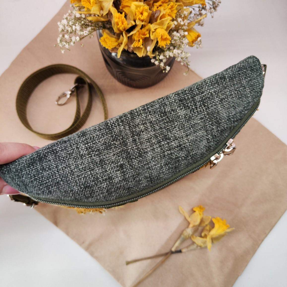 Unikat!!! - tylko 1 sztuka. Nerka półksiężyc jeszcze większa od nereczki półksiężyc. Uszyta z końcówek tkanin, żeby nie marnować, w duchu zero waste. Wewnątrz nerki wszyta bawełniana podszewka oraz kieszonka przegródka. W komplecie również regulowany pasek z możliwością wymiany na inny kolor. Wymiary nerki: 25 cm x 18 cm x 8 cm klapa. Nerka idealna na drobiazgi takie jak portfel, telefon, dokumenty, kluczyki, chusteczki.