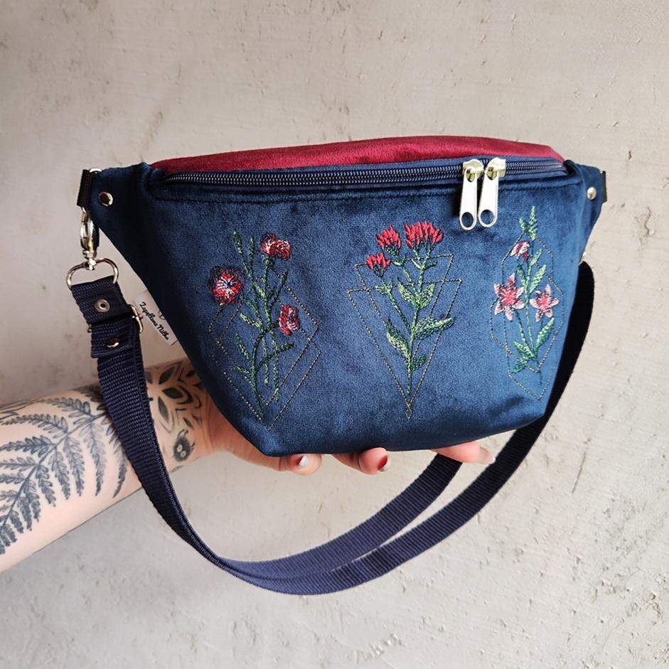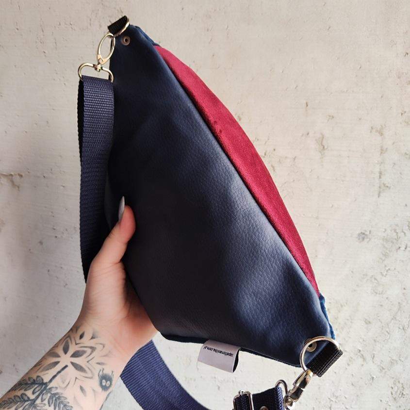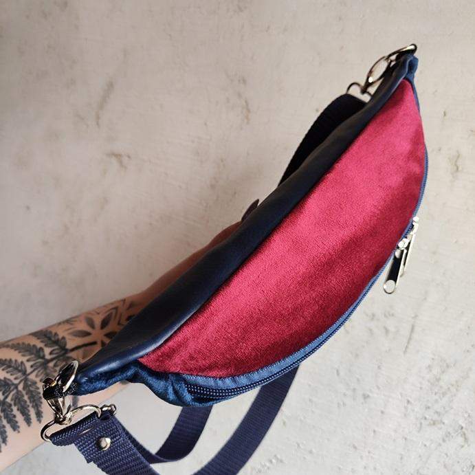Nerka uszyta z aksamitu bordowego i granatowego, eko skóry granatowej oraz bawełny. Na przodzie haft komputerowy. Tył nerki wykonany z eko skóry, tkanina jest śliska, dzięki czemu nerka nie czepi się naszego ubrania. Regulowany pasek nośny z możliwością wymiany (nerka posiada po bokach 2 metalowe półkola, które umożliwiają szybkie zapinanie/ wymianę paska np. na inny kolor). Wymiary: 32cmx17cmx7cm (klapa). Kieszonka w formie przegródki na tylnej ściance (środek nerki). Obwód paska wraz z nerką ma wymiary: minimum 95cm obwód, max 140cm obwód (jeśli interesuje Cię inny obwód paska napisz do mnie wiadomość). W komplecie pasek czarny szeroki na 2,5cm.