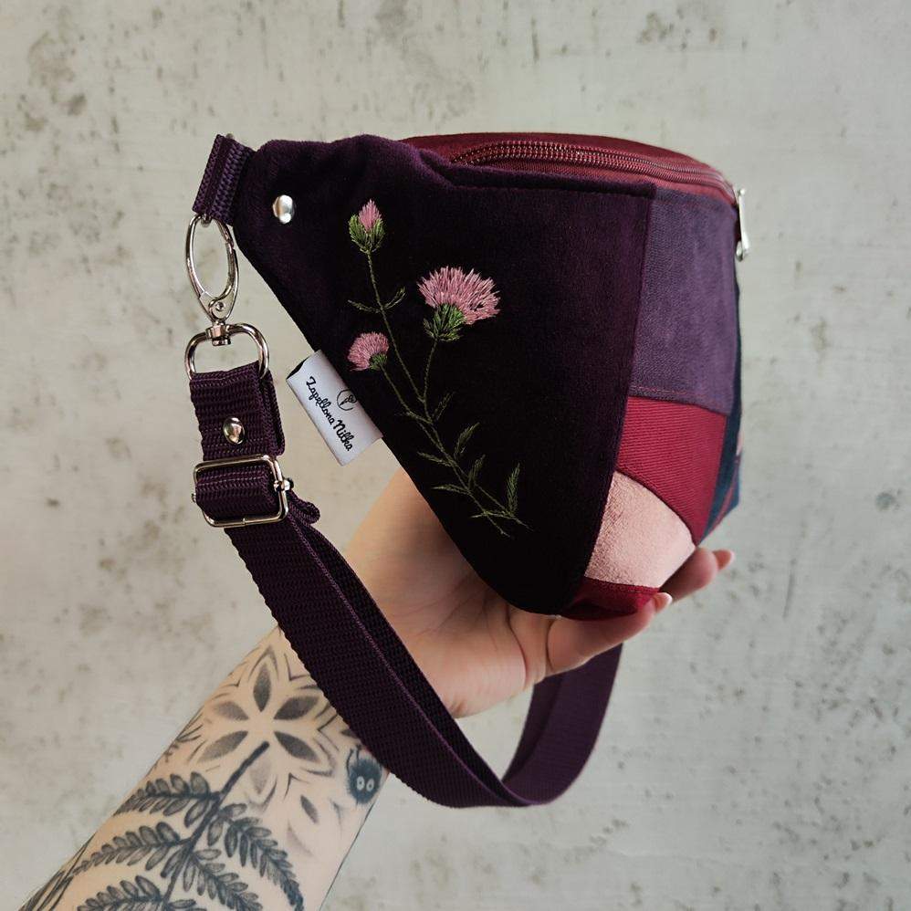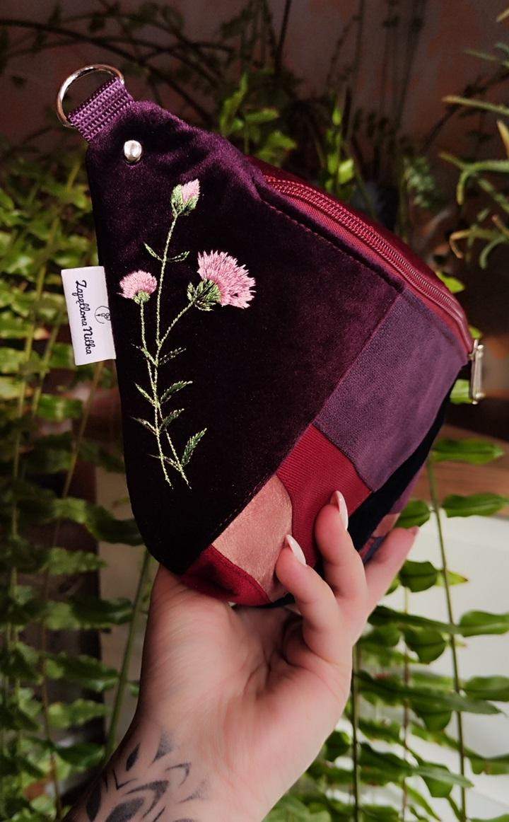 Nerka XXL UNIKAT- tylko 1 sztuka! Uszyta ze skrawków tkanin pochodzących z innych projektów, żeby nie marnować. Po boku nerki dekoracyjny haft goździków. Regulowany pasek nośny z możliwością wymiany (nerka posiada po bokach 2 metalowe półkola, które umożliwiają szybkie zapinanie/ wymianę paska np. na inny kolor). Wymiary: 32cmx18cmx7cm (klapa) .W środku kieszonka zapinana na zamek oraz kieszonka przegródka. Obwód paska wraz z nerką ma wymiary: minimum 95cm obwód, max 140cm obwód (jeśli interesuje Cię inny obwód lub inny kolor paska napisz do mnie wiadomość).