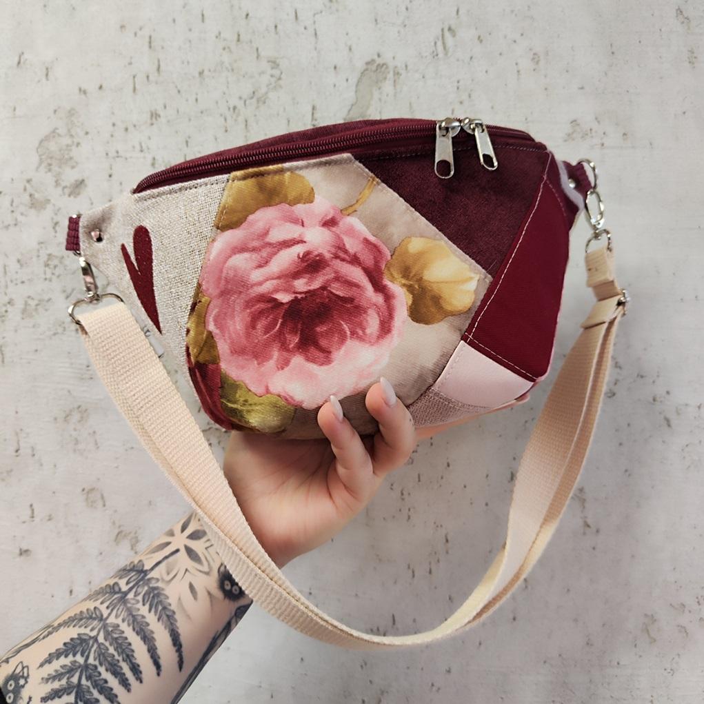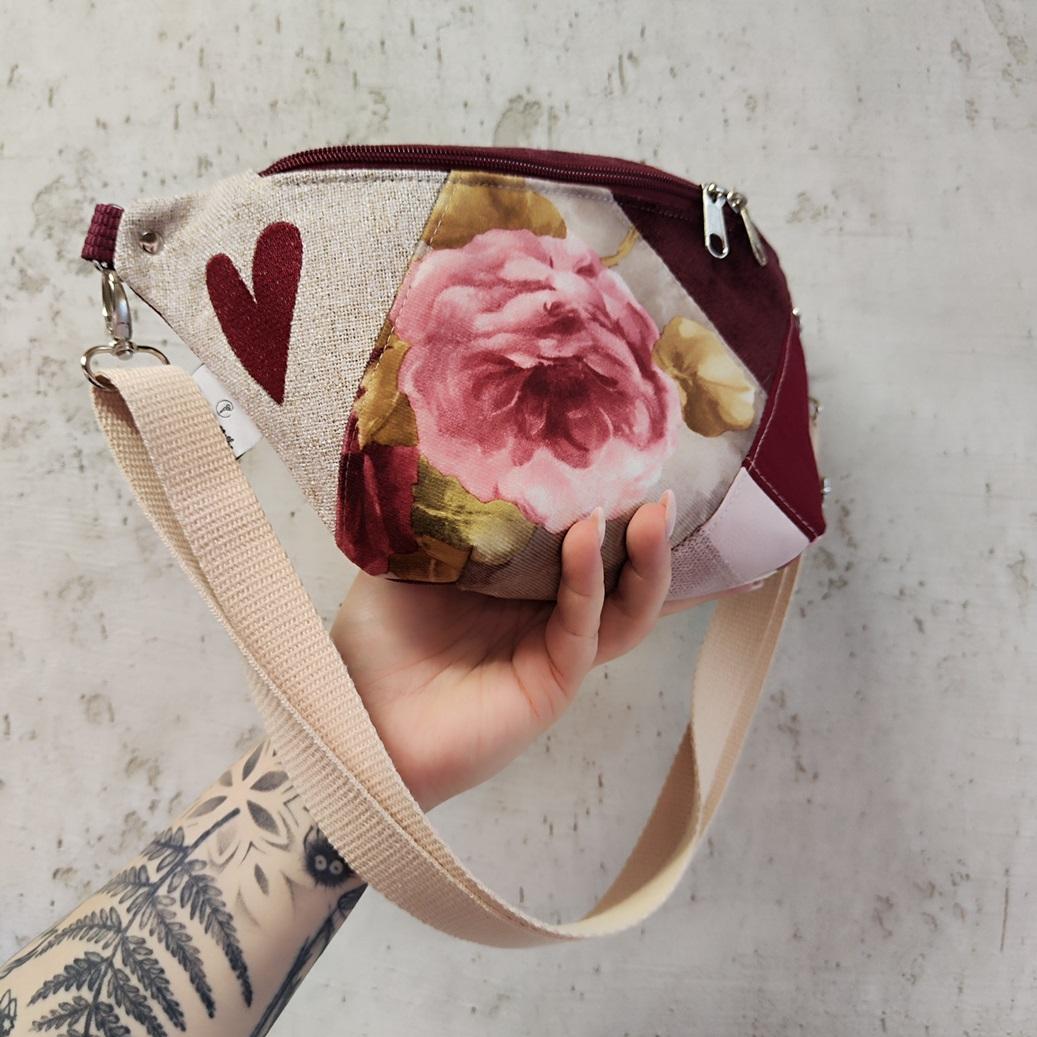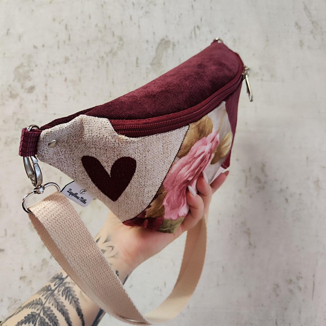 Nerka XXL UNIKAT- tylko 1 sztuka! Uszyta ze skrawków tkanin pochodzących z innych projektów, żeby nie marnować. Po boku nerki haft czerwone serce. Regulowany pasek nośny beżowy bawełniany z możliwością wymiany (nerka posiada po bokach 2 metalowe półkola, które umożliwiają szybkie zapinanie/ wymianę paska np. na inny kolor). Wymiary: 32cmx18cmx7cm (klapa) .W środku kieszonka zapinana na zamek oraz kieszonka przegródka. Obwód paska wraz z nerką ma wymiary: minimum 95cm obwód, max 140cm obwód (jeśli interesuje Cię inny obwód lub inny kolor paska napisz do mnie wiadomość).